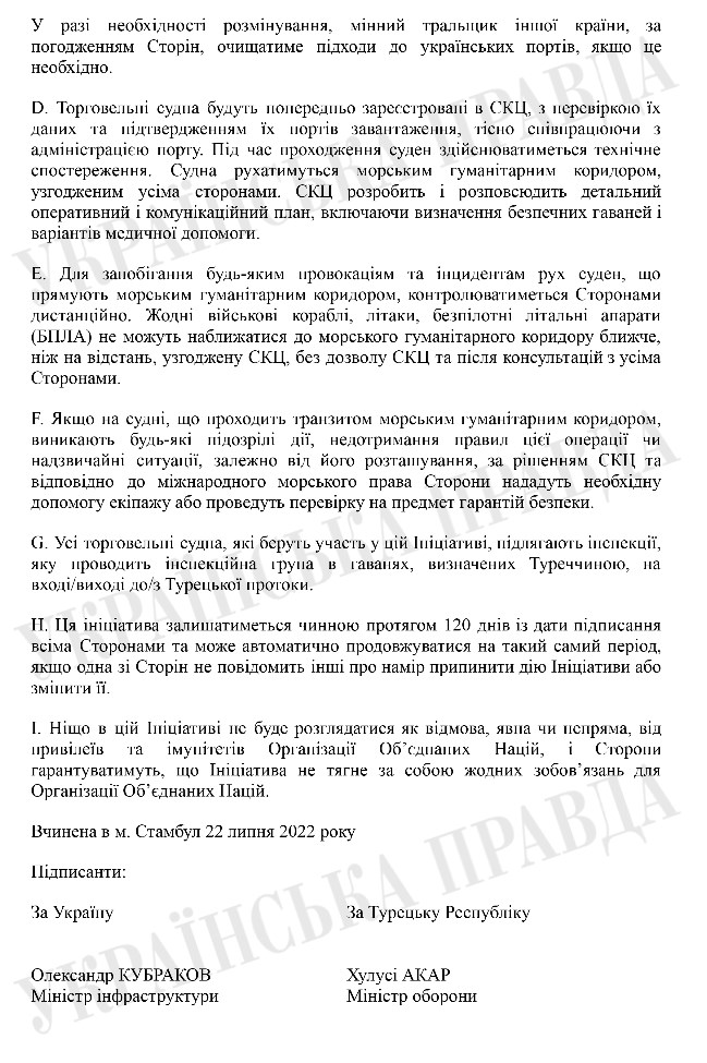 Инициатива, подписанная представителями Турции, ООН и Украины, должна быть утверждена Кабмином и обнародована в полном объеме. Такой же документ подписали представители Турции, ООН и России. С украинской стороны, документ подписал министр Инфраструктуры Александр Кубраков. С российской стороны Инициативу подписал министр обороны России Сергей Шойгу.