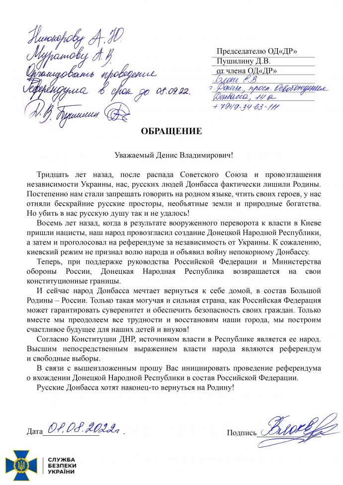 В дальнейшем планируют подготовить обращение якобы от местных жителей к руководству оккупационной администрации по "присоединению" Донбасса к России. В распоряжении СБУ уже есть несколько документов, которые удалось перехватить.