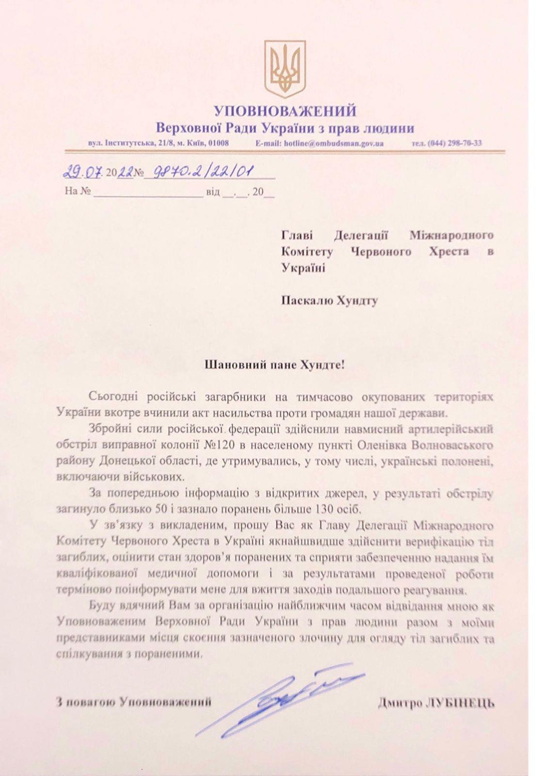 Источник: письмо Лубинца главе делегации Международного комитета Красного креста в Украине Паскалю Хундту, имеющееся в распоряжении УП
