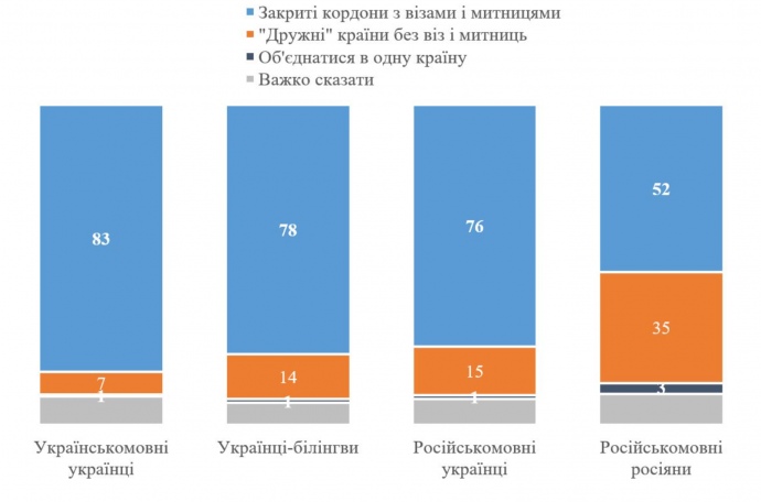 Даже среди русскоязычных украинцев 76% хотят закрытых границ, а среди украинцев-билингвов эту идею поддерживает 78%.
