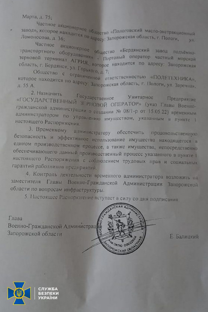 В результате псевдопредприятию "Государственный зерновой оператор" было незаконно передано имущество 7 агропромышленных комплексов и зерновых терминалов на оккупированной россиянами территории Запорожской области.