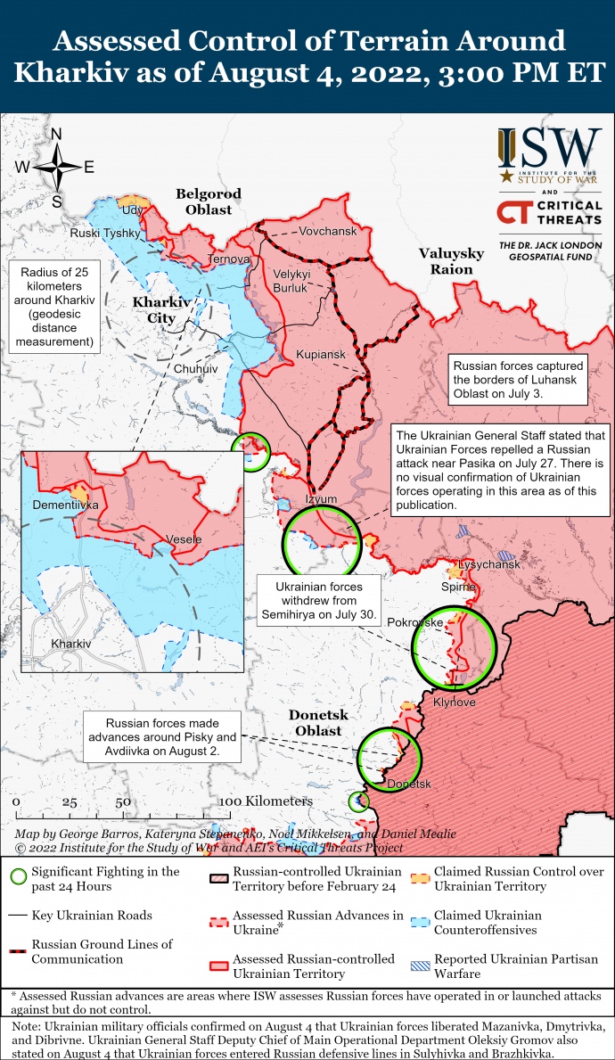 - Украина, вероятно, перехватывает стратегическую инициативу и заставляет Россию перераспределять силы и менять приоритеты усилий в ответ на украинские контрнаступательные операции.