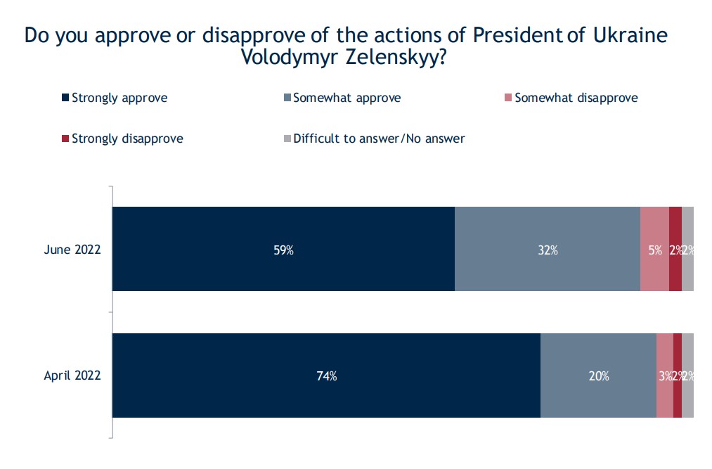На вопрос, поддерживают ли они действия президента Владимира Зеленского, 59% ответили, что решительно поддерживают и 32% - что скорее поддерживают. Таким образом, в целом поддерживают действия президента 91% опрошенных. При этом решительно не одобряют их всего 2% респондентов, еще 5% - скорее не одобряют.