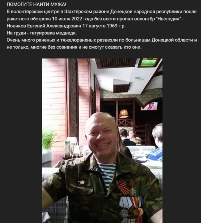 Его родственники сообщали о пропаже в донецких пабликах в соцсетях: "На груди у Новикова — татуировка медведя".