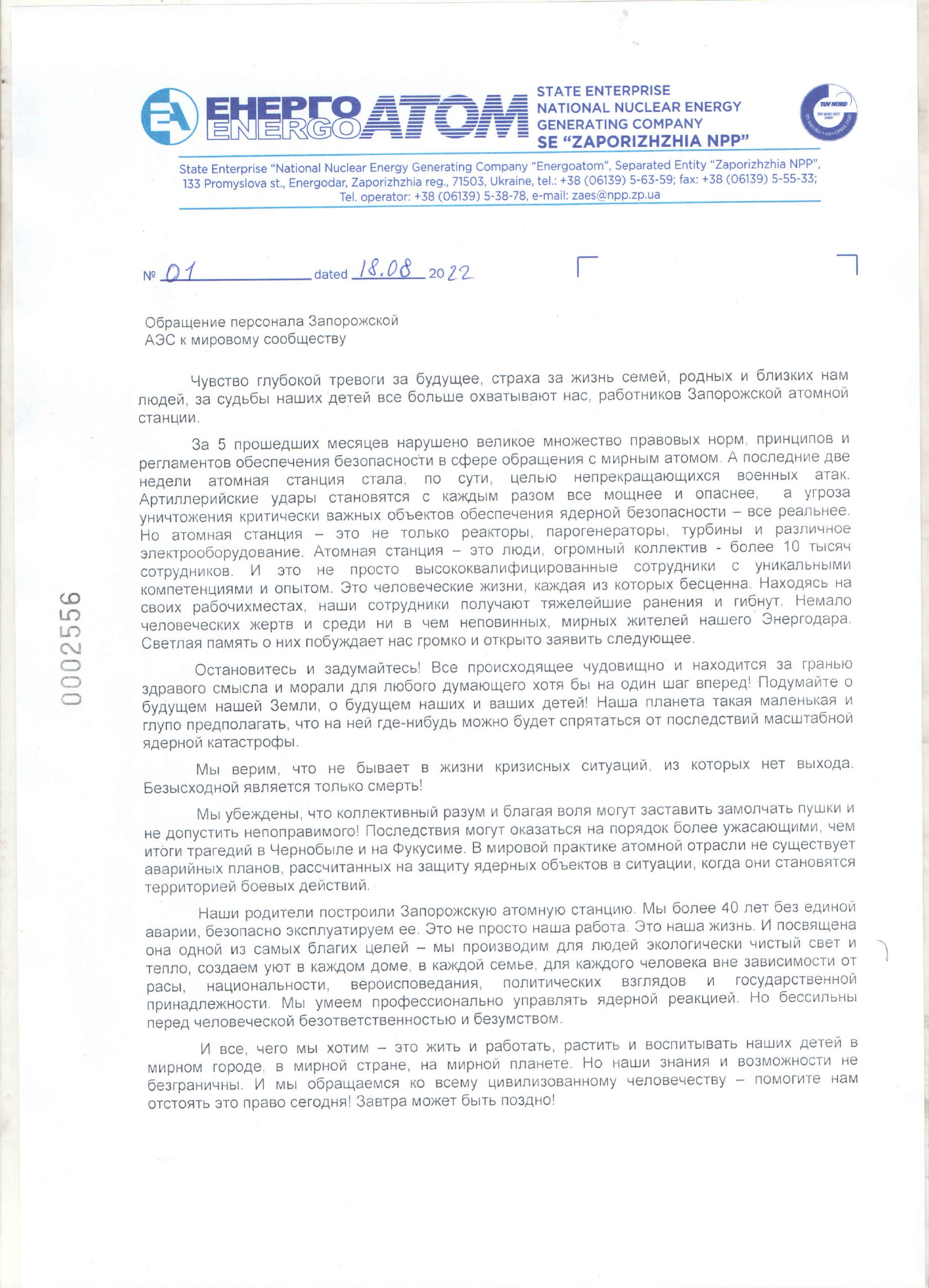 Персонал Запорожской АЭС призывает мировое сообщество предотвратить катастрофу на ЗАЭС, которая может иметь на порядок более ужасающие последствия, чем аварии на Чернобыльской АЭС и на Фукусиме в Японии.