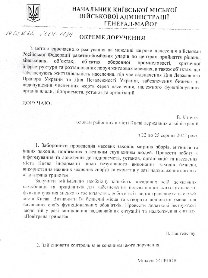 Киевская городская военная администрация запретила проводить массовые мероприятия в Киеве в период с 22 по 25 августа в связи с высокой вероятностью ракетных обстрелов города российскими оккупантами.