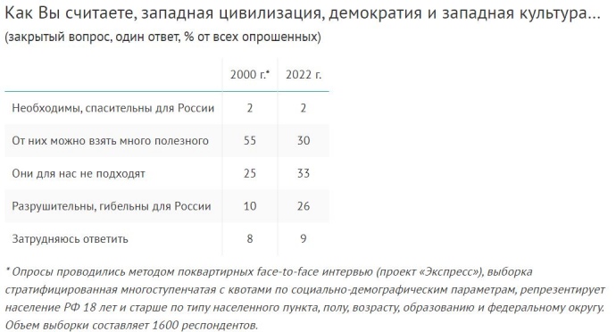 Дословно: "Больше половины россиян (59%) не видят пользы от западной цивилизации, демократии и культуры: 33% считают, что они не подходят нам, а 26% называют их разрушительными".