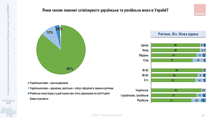 Подавляющее большинство – 86% – считают, что украинский язык должен быть единственным государственным языком. 10% поддерживают статус русского как официального в отдельных регионах и только 3% за русский как второй государственный язык в Украине.
