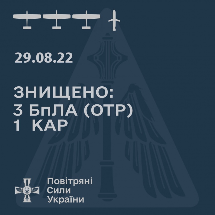 Кроме того, 29 августа удалось уничтожить 3 вражеских БпЛА и одну управляемую авиаракету класса "воздух-поверхность" Х-59.