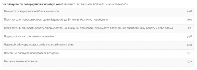 Дословно: "Давая ответ о намерениях возвращения в Украину, 36% респондентов выражают намерение вернуться после того, как убедятся, что в местности, где они жили, безопасно находиться, 35% — сразу после окончания войны, 13% — через год или через несколько лет после окончания войны, 7% — после того, как возобновит работу предприятие, на котором они работали или будут уверены, что найдут другую работу у себя дома, 11% планируют вернуться в ближайшее время, а 7% вообще не планируют возвращаться в Украину (среди имеющих постоянную работу в стране пребывания таких 18%)".
