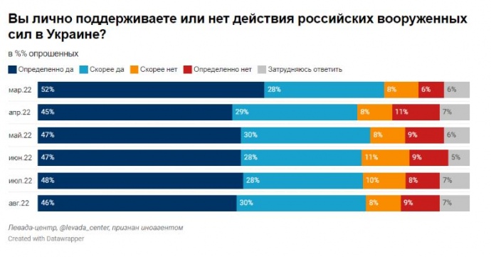 Дословно: "Уровень поддержки действий ВС РФ в Украине за летние месяцы не изменился: 46% "определенно поддерживают" действия российских вооруженных сил и еще 30% "скорее поддерживают".