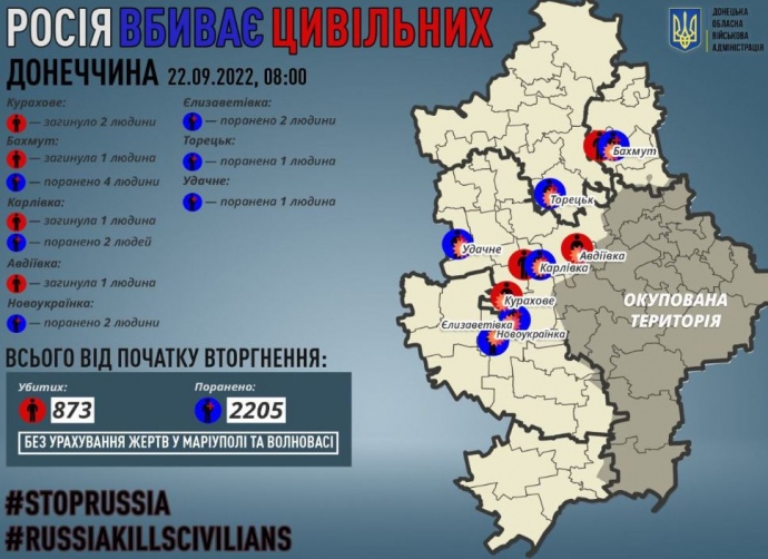 Детали: По его данным¸ 2 человека погибли в Курахово, 1 - в Бахмуте, 1- в Авдеевке и 1 - в Карловке. Еще 12 человек получили ранения.
