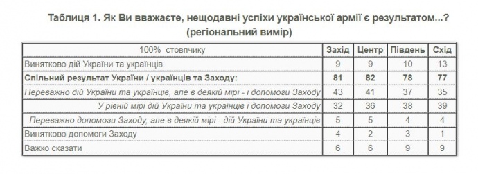 Для 80% украинцев успехи украинской армии являются общим достижением и общим результатом действий Украины и украинцев и поддержки Запада.