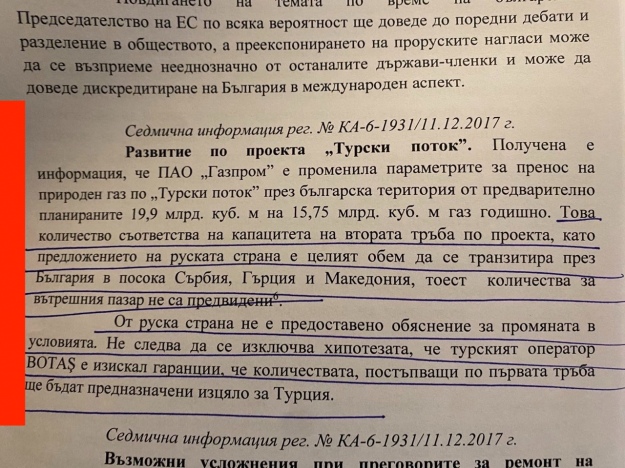 Еще одна справка, датированная декабрем 2017-го, свидетельствует, что уже тогда и Борисов, и Радев знали, что Болгария не получит никакого газа через "Балканский поток". Там говорилось о том, что "Газпром" в одностороннем порядке изменил параметры транспортировки газа через болгарскую территорию, и весь объем будет транзитироваться через Болгарию в направлении Сербии, Греции и Македонии, поскольку "объемы для внутреннего рынка не предусмотрены".