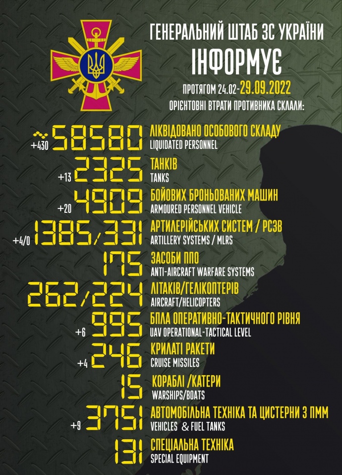 Общие боевые потери РФ с 24.02 по 29.09 ориентировочно составили: