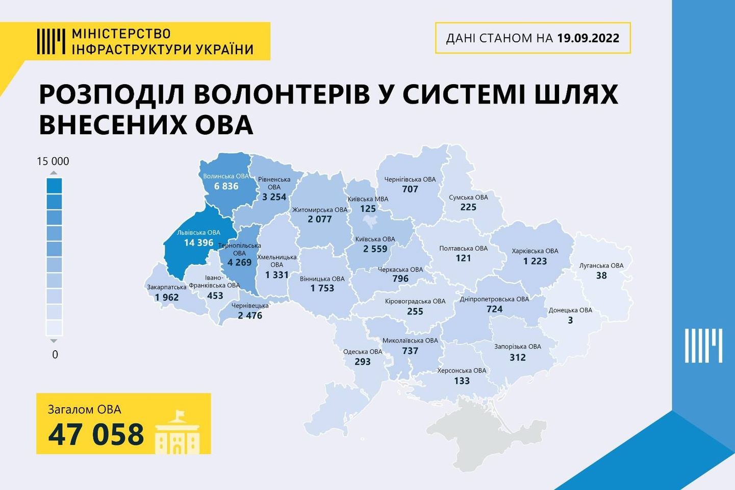 Больше всего волонтеров-заявителей подали свои данные в систему через Львовскую, Волынскую и Тернопольскую областные военные администрации. При их содействии в целом за пределы Украины выехали более половины из числа всех волонтеров, внесенных в систему.