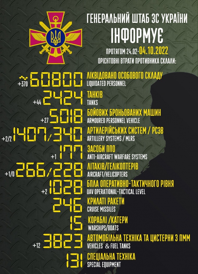 Общие боевые потери РФ с 24.02 по 04.10 ориентировочно составили: