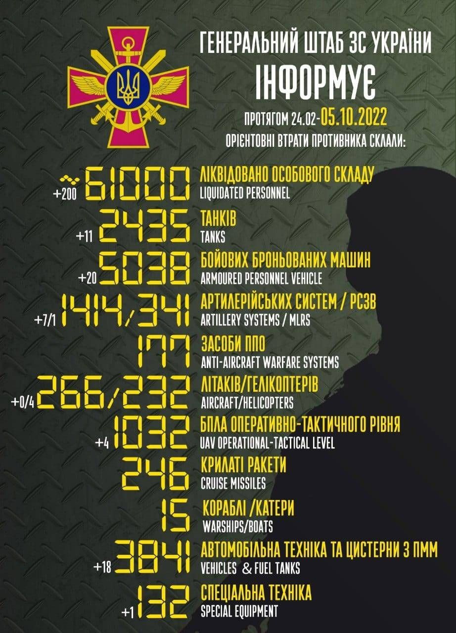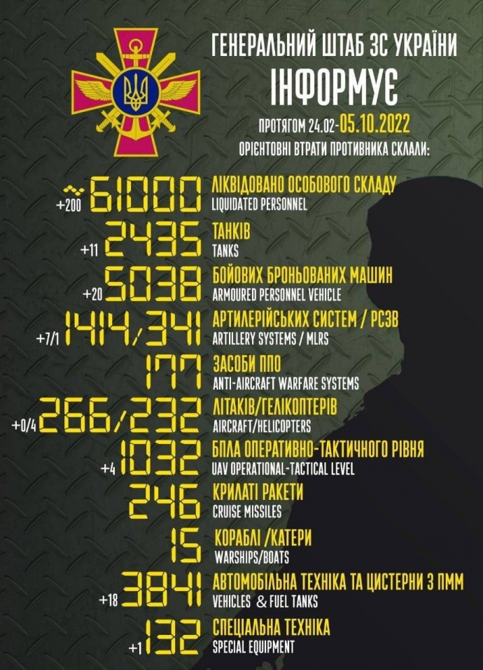 Общие боевые потери РФ с 24 февраля по 5 октября ориентировочно составили: