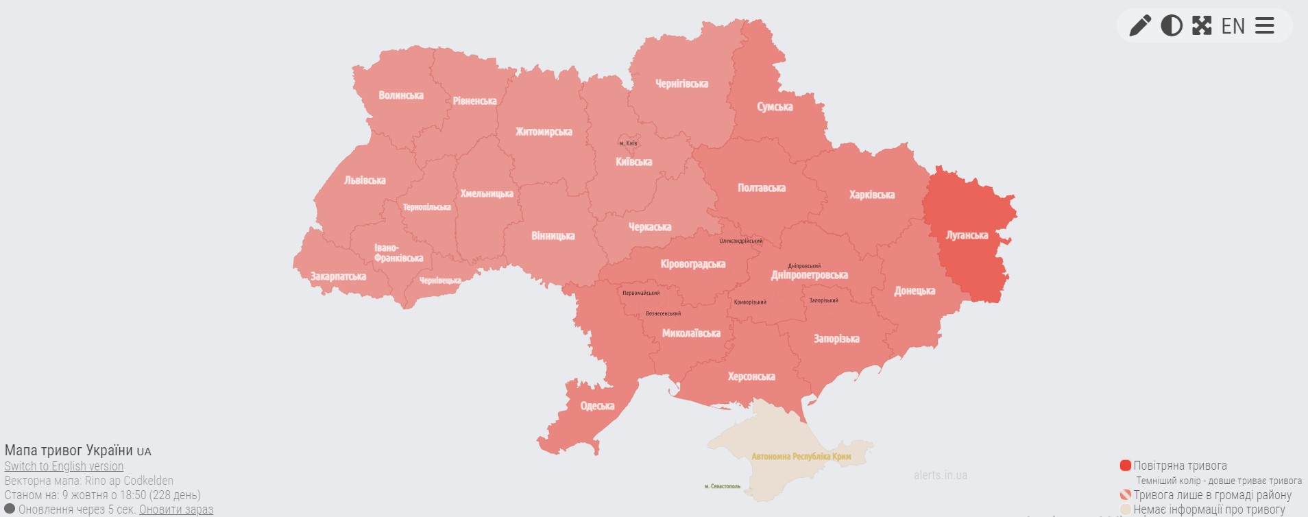 Детали: По состоянию на 18:50 тревога объявлена во всех областях, кроме оккупированного Крыма.