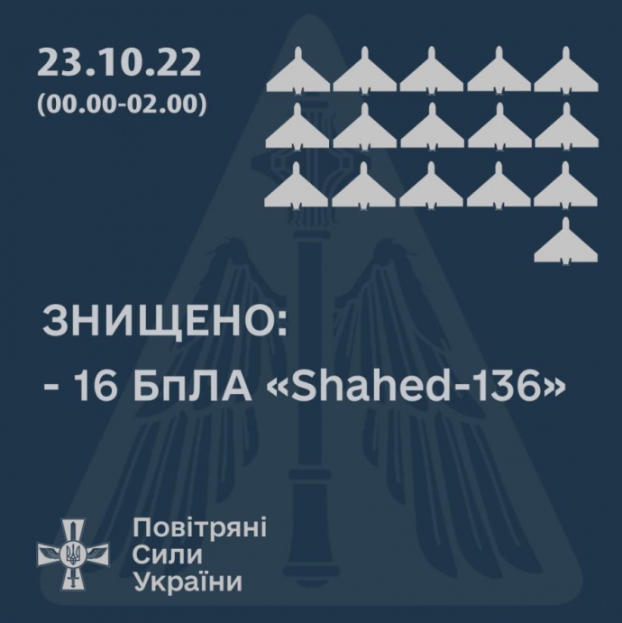 За минувшую ночь противовоздушная оборона сбила 16 ударных дронов-камикадзе "Shahed-136".
