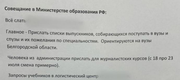 В одном из документов указано, что дети должны ориентироваться исключительно на высшие учебные заведения в Белгородской области.