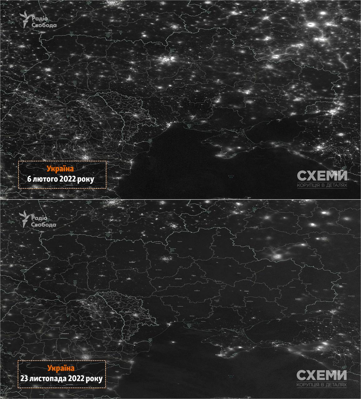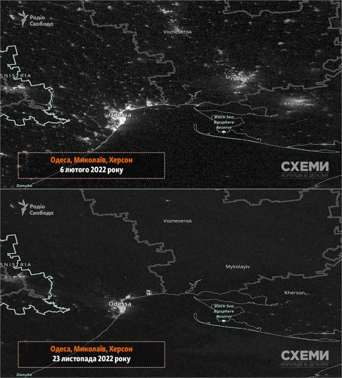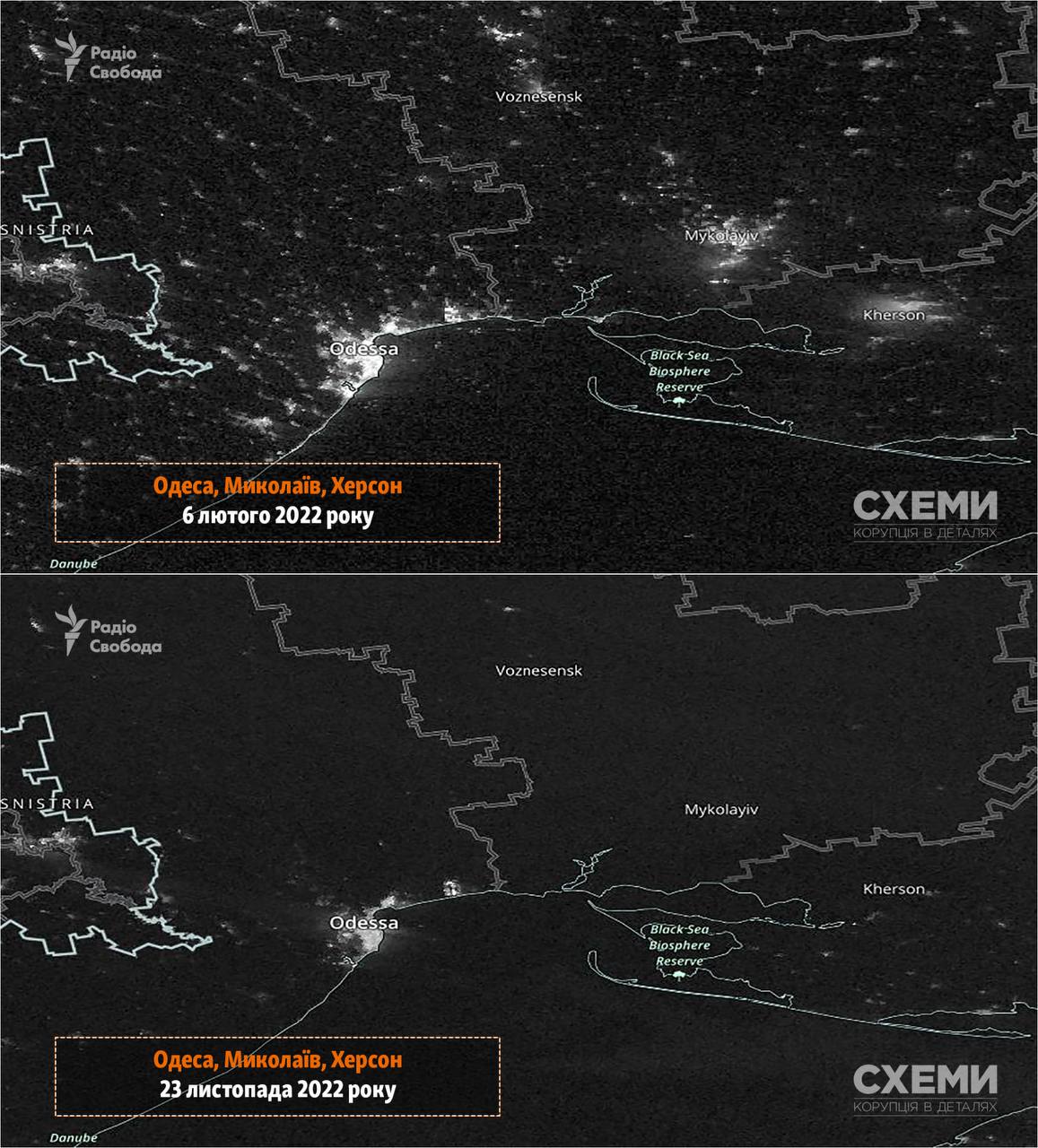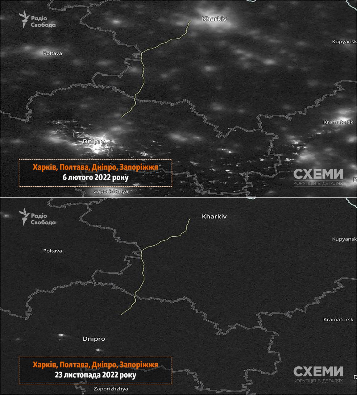 Программа Радио Свобода "Схемы" опубликовала сравнение спутниковых фото украинских городов до начала полномасштабного вторжения РФ и 23 ноября после массированного ракетного обстрела.