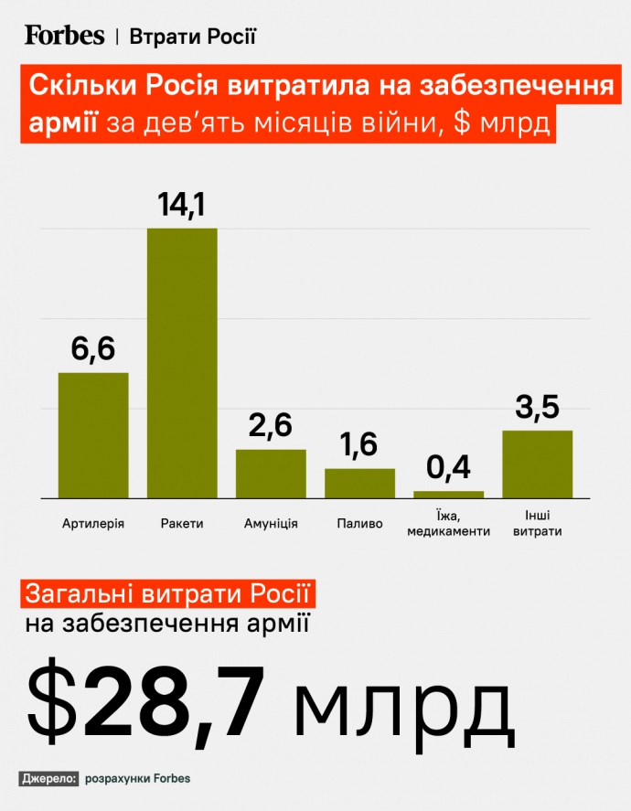 Если говорить только об обеспечении армии, то больше всего расходов произошло из-за использования ракет (14,1 млрд). По Украине враг выпустил более 4000 ракет, средняя стоимость одной составляет $3 млн. Кроме этого на обеспечение артиллерии ушло 6,6 млрд долларов.