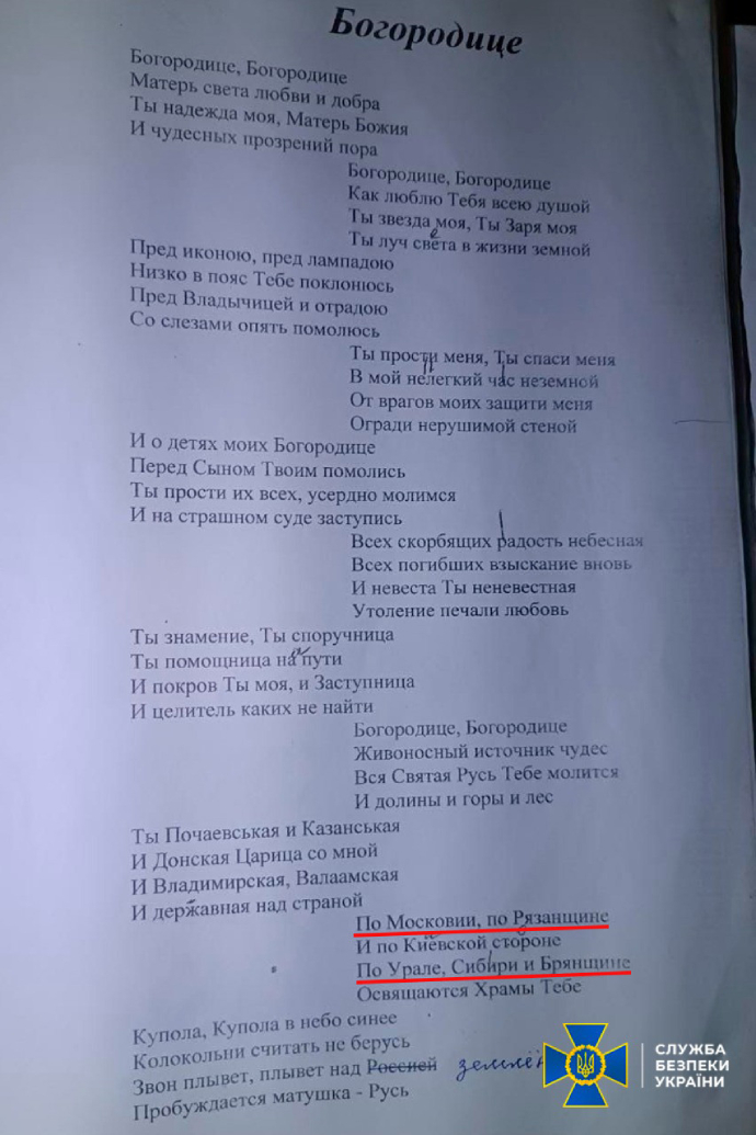 Также во время мероприятий СБУ нашла тексты пророссийских песен, которыми прославляли "русскую землю" и призывали к "пробуждению матушки-Руси".