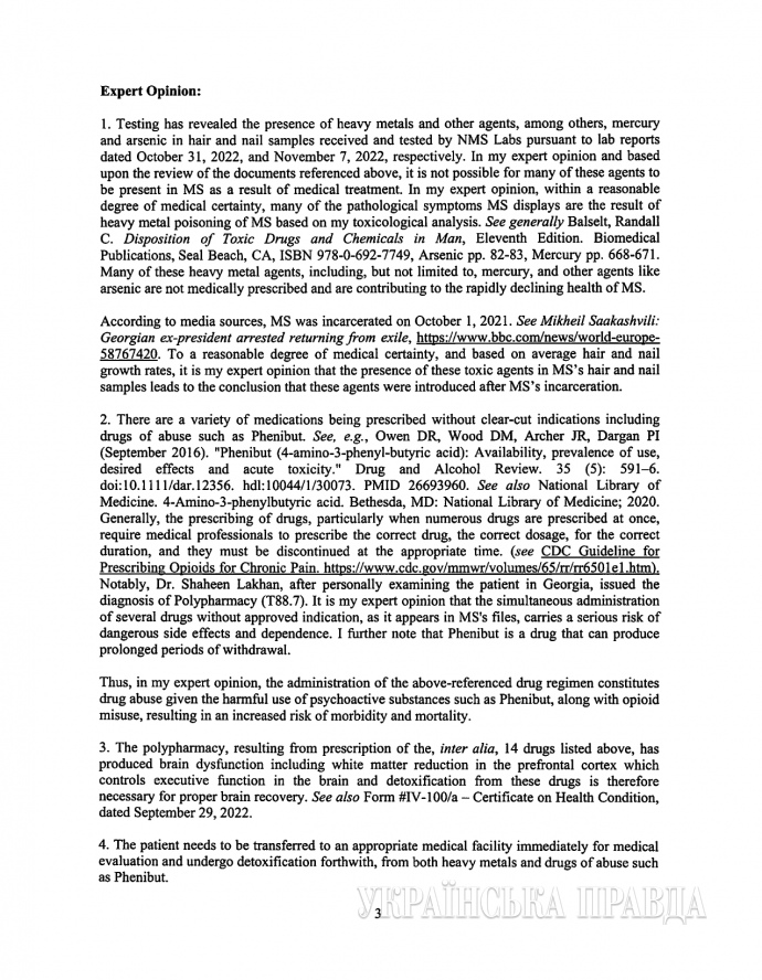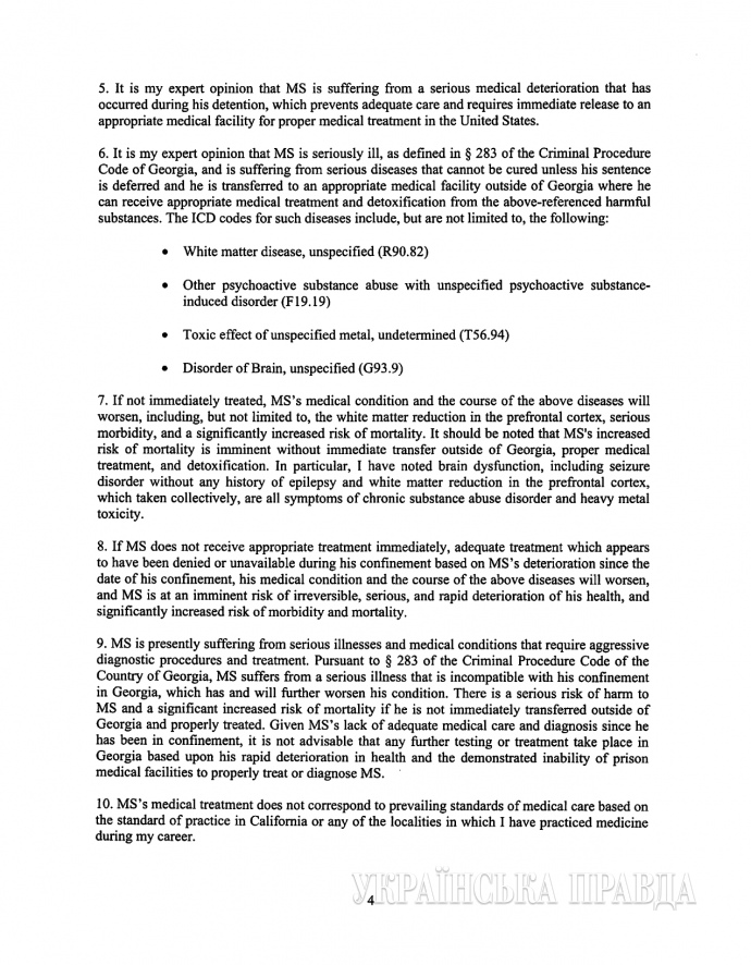 "Меня привлекли для предоставления экспертного заключения о состоянии здоровья Михеила Саакашвили, результатов токсикологических исследований биологических образцов, полученных от него, оказания ему медицинской помощи, а также о необходимости его немедленного перевода в другое медицинское учреждение за пределами Грузии для надлежащего лечения и детоксикации", - говорится в заключении врача.
