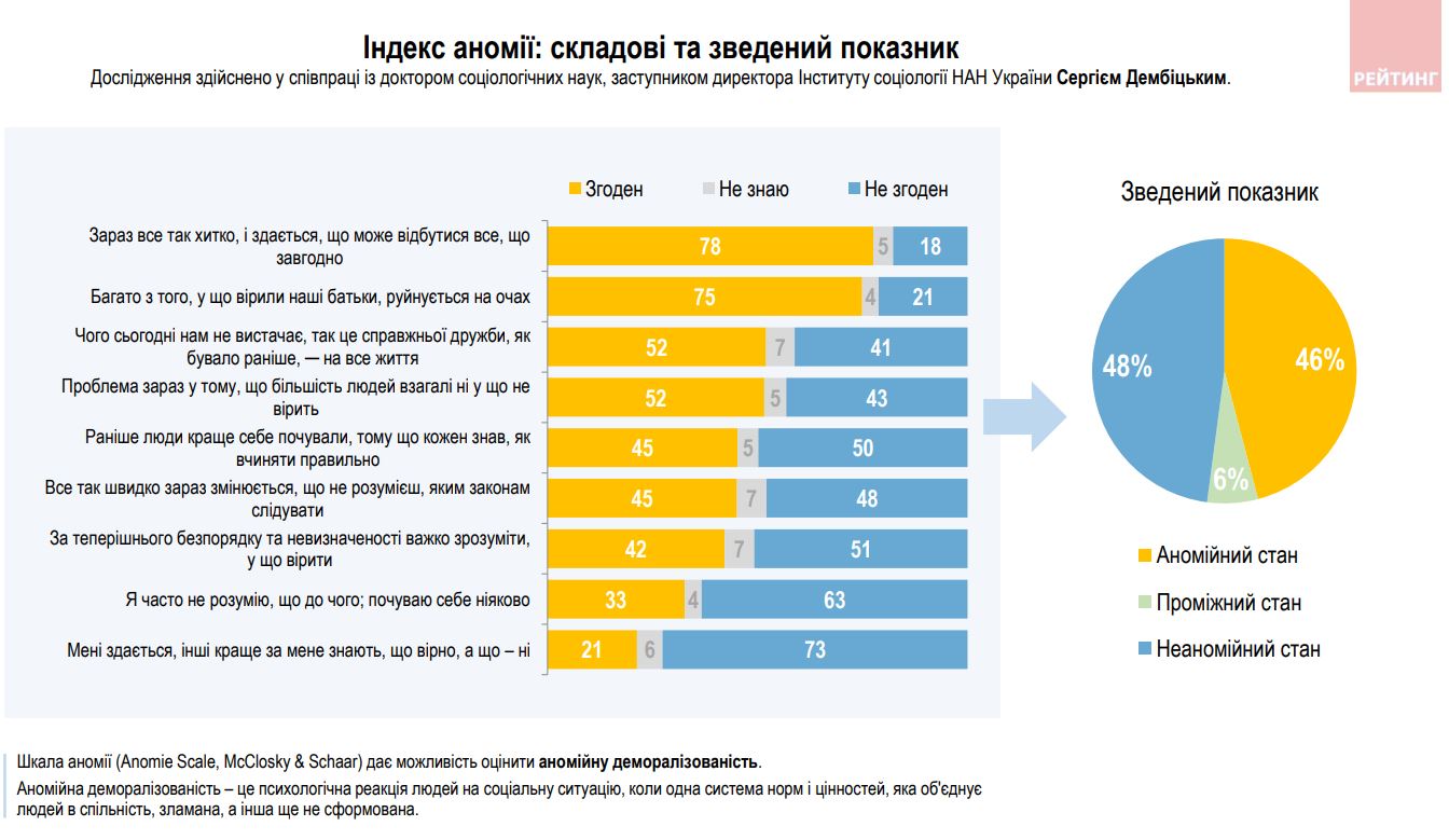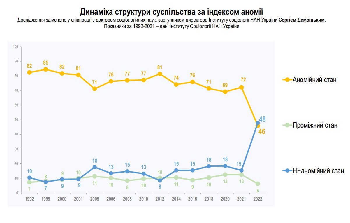Но после начала широкомасштабной войны России против Украины в начале 2022 года аномийные настроения в Украине существенно уменьшились и перестали быть определяющими.