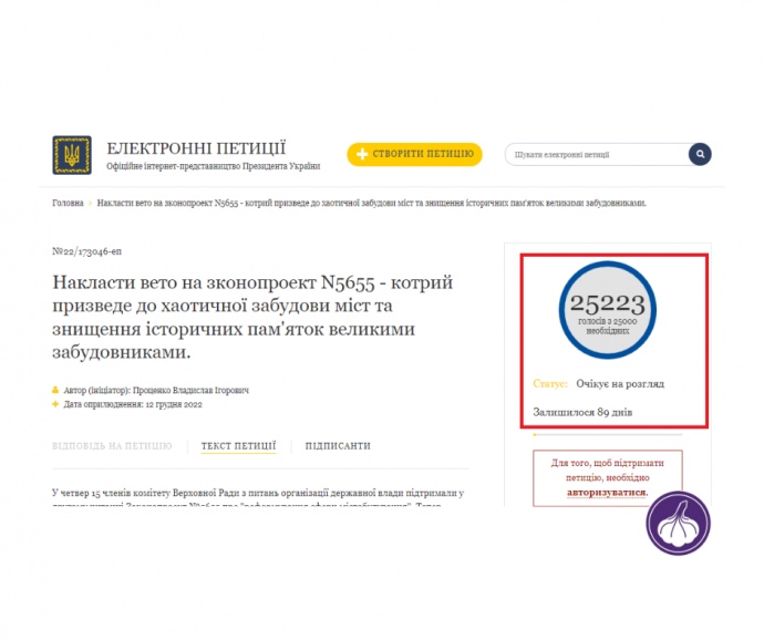 Петиция с требованием ветировать законопроект 5655 по реформированию сферы градостроительной деятельности набрала более 25 000 голосов в рекордно сжатые сроки.