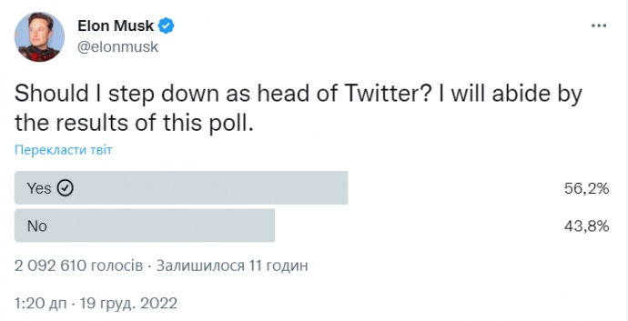 Маск запустил голосование, должен ли он уйти с должности руководителя Twitter
