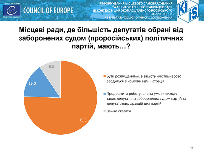 Дословно КМИС: "К депутатам от запрещенных судом пророссийских партий жители Украины настроены преимущественно жестко, а к созданию военных администраций населенных пунктов относятся одобрительно. Так, 75,5% считают, что местные советы, где большинство составляют депутаты от запрещенных партий, следует распустить".