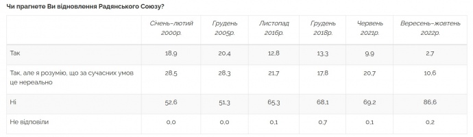Если в 2000 году лишь чуть больше половины (53%) респондентов однозначно отвечали, что не стремятся к восстановлению Советского Союза, то в 2021 году доля таких составляла уже 69%, по данным последнего опроса (2022 год) - 87%.