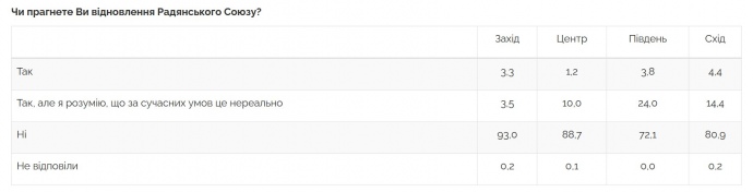 Доля тех, кто не хотел бы восстановления СССР, составляет подавляющее большинство во всех регионах Украины, включая восток и юг.