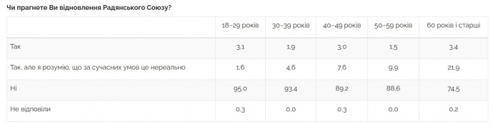 Даже среди представителей старшей возрастной группы, те, кто не хотел бы восстановления Советского Союза, составляют подавляющее большинство (74,5%), а среди тех, кому меньше 30 лет, эта доля возрастает до 95%.