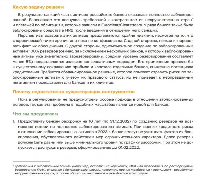 Дословно: "Пока в регулировании не предусмотрено особых подходов к заблокированным активам, поскольку эта проблема в подобных масштабах является новой для банков".