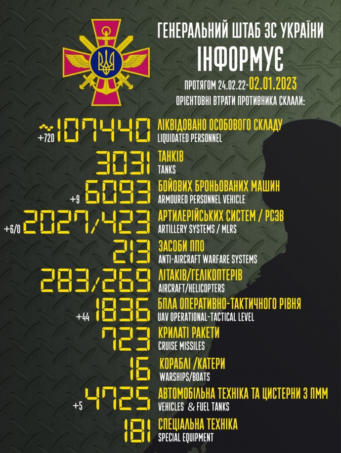 Источник: подсчеты Генерального штаба Вооруженных сил Украины по состоянию на утро 2 января