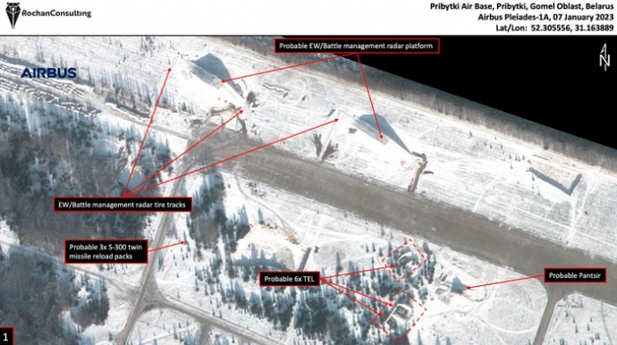 Спутник зафиксировал ЗРК "С-300/400", ЗРПК "Панцирь" и другую технику на белорусском военной аэродроме "Зябровка" в Гомельской области, недалеко от границы с Украиной.