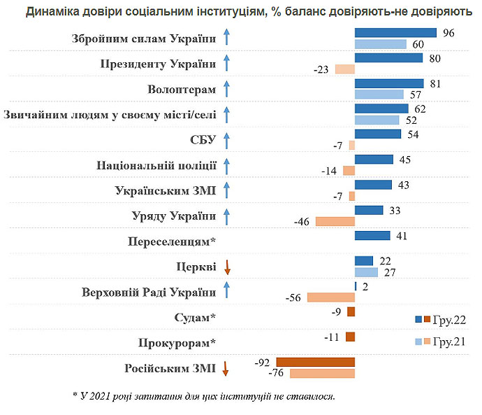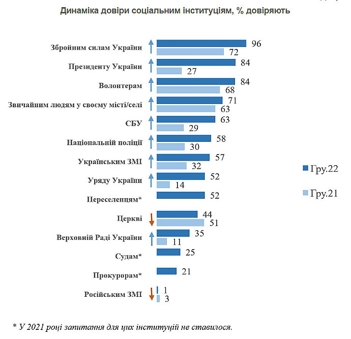 Дословно социологи: "Наибольшим доверием в Украине продолжают пользоваться Вооруженные силы, и за последний год (между декабрем 2021 и декабрем 2022 годов) уровень доверия вырос с 72% до 96%. Баланс доверия-недоверия ВСУ (то есть разница между долей тех, кто доверяет, и долей тех, кто не доверяет) составляет +96% (в декабре 2021 года было +60%). Далее идет доверие к президенту Украины и доверие к волонтерам".