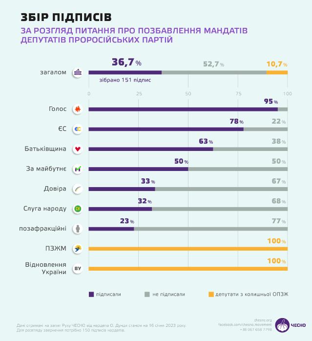 Детали: Отмечается, что наибольший процент подписей дали фракции "Голос" (95%) и "Европейская солидарность" (78%).