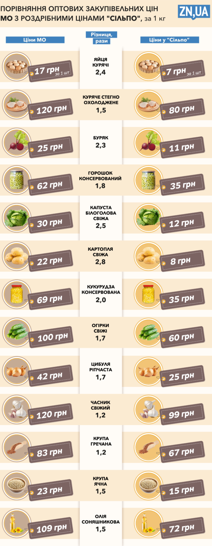 Для сравнения издание выбрало сеть магазинов "Сильпо" в спальном районе Киева. Цены на самые ходовые продукты оказались завышенными в 2-3 раза.