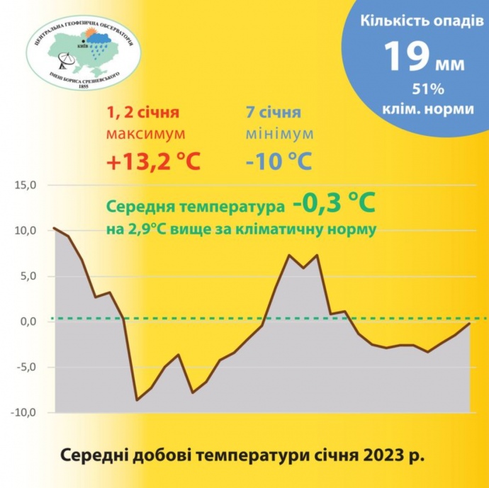 Дословно: "По данным наблюдений метеостанции ЦГО имени Бориса Срезневского среднемесячная температура воздуха января в Киеве составила -0,3°С, что выше климатической нормы на 2,9°С. Он вошел в десятку самых теплых с 1881 года.