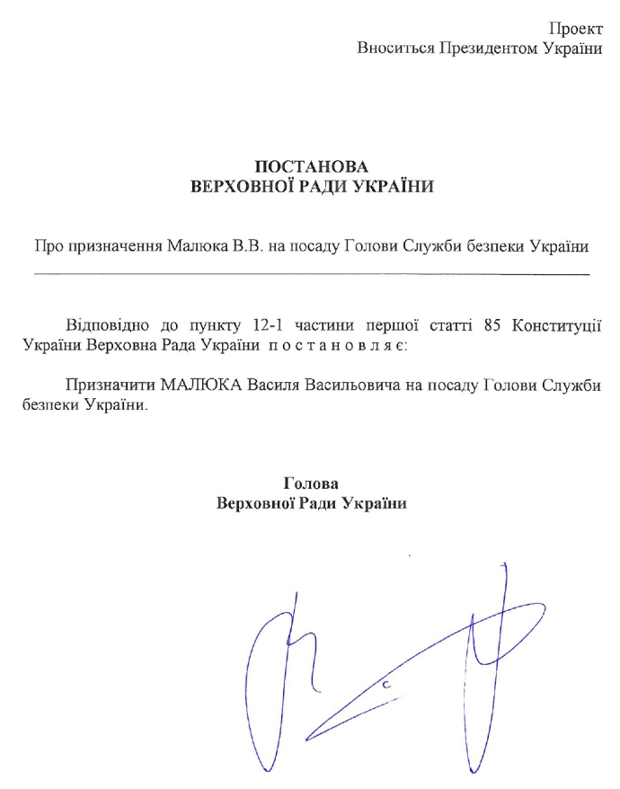 Зеленский внес Малюка в Верховную Раду