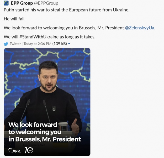 На прошлой неделе Зеленский допустил возможный личный визит в Брюссель для выражения благодарности за поддержку Украины, если будет шанс получить дальнобойное оружие и если визит позволит ситуация с безопасностью.