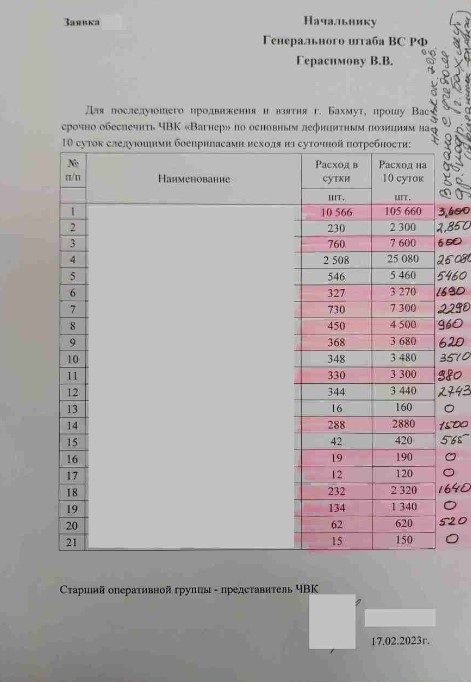 При этом Пригожин обнародовал потребности боевиков в боеприпасах на сутки для того, чтобы продолжить вести наступление на Бахмут.