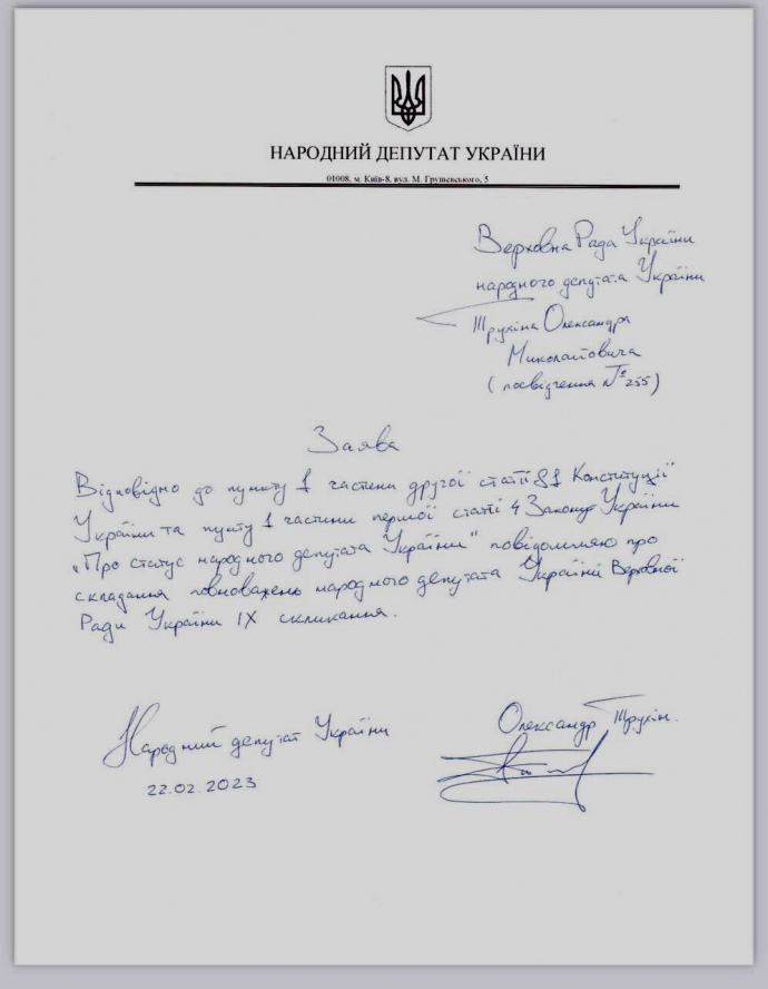 Детали: Железняк опубликовал заявление Трухина. Он также добавил, что соответствующее постановление уже внес регламентный Комитет ВРУ и зал рассмотрит его на ближайшем заседании.