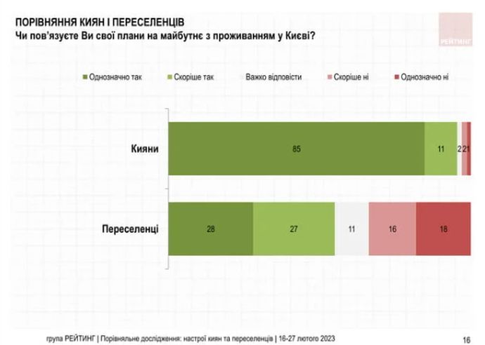 Дословно: "Среди переселенцев однозначно связывают свои планы с Киевом 28%, еще 27% – скорее связывают. Около трети ВПЛ не планируют свою будущую жизнь в столице.