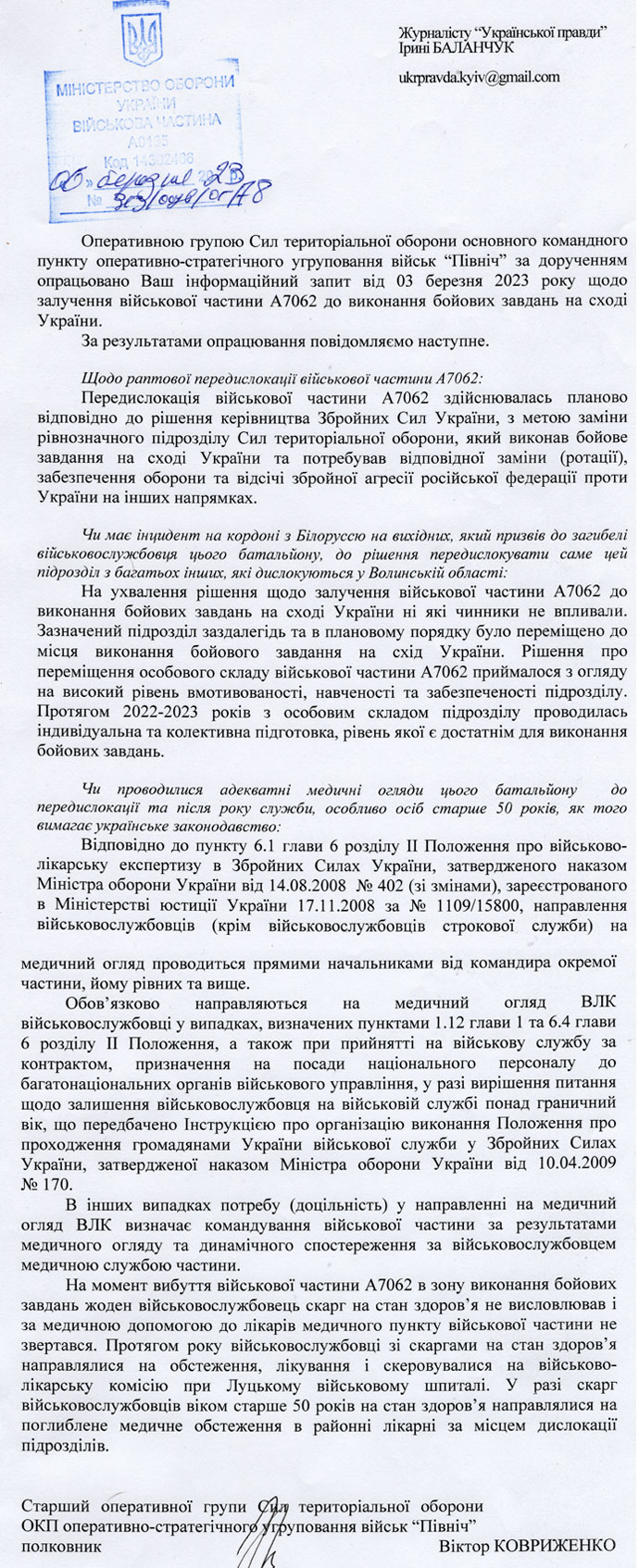 Также в ответе на запрос добавили, что "в течение года военнослужащие с жалобами на состояние здоровья направлялись на обследование, лечение и направлялись на военно-врачебную комиссию при Луцком военном госпитале".