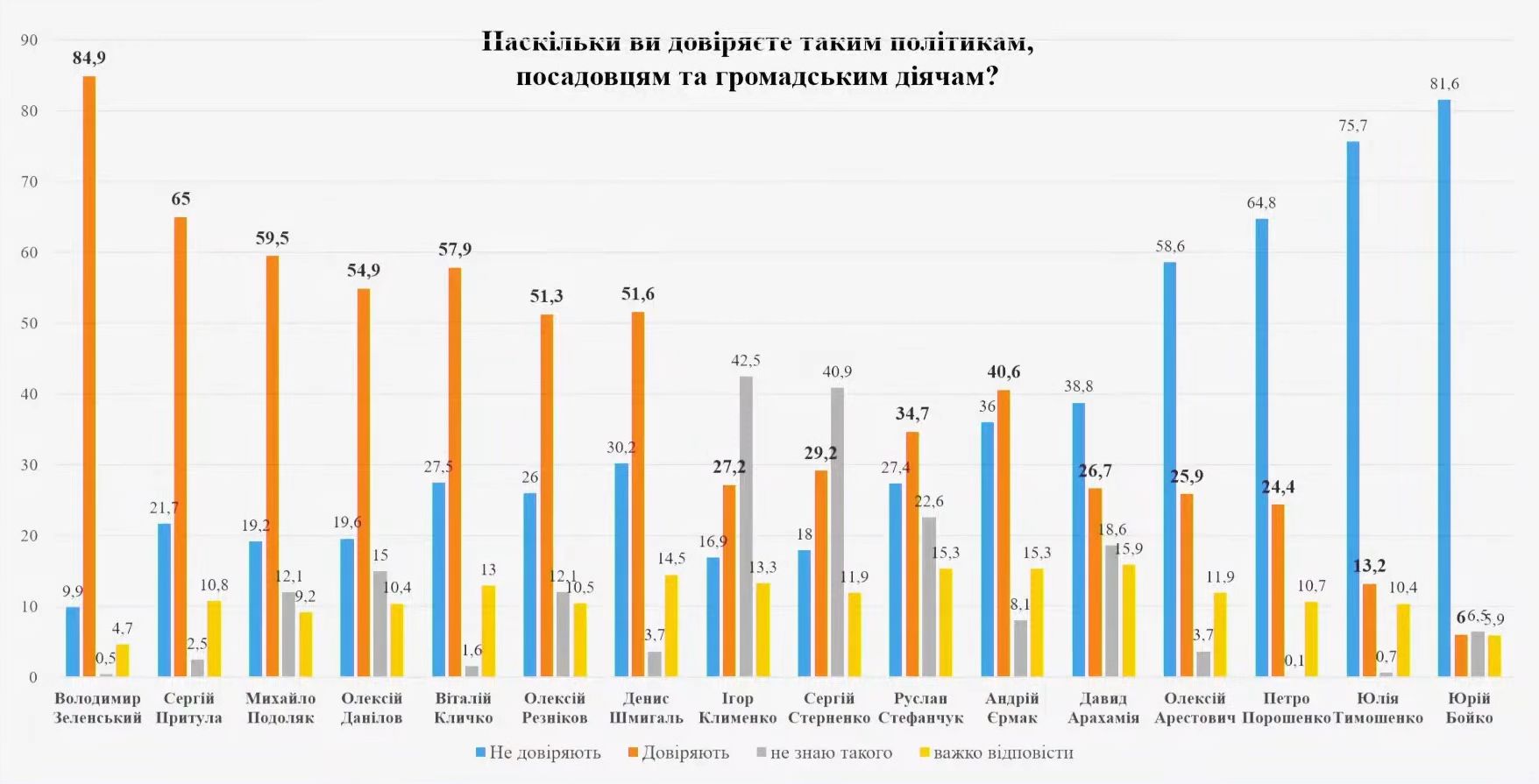 Наибольшим доверием украинцев среди политиков и публичных деятелей пользуется Владимир Зеленский, за ним с большим отрывом следуют Сергей Притула, Михаил Подоляк, Виталий Кличко и Алексей Данилов.